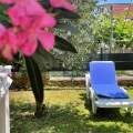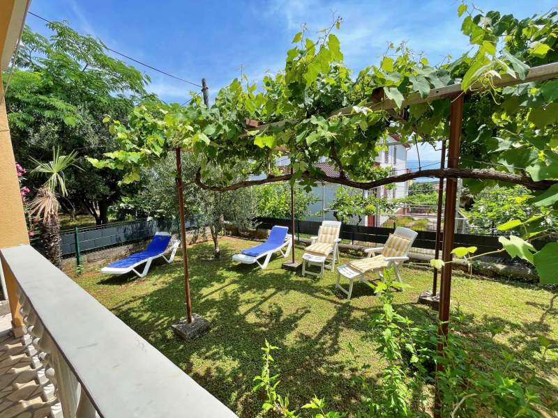 This elevated ground-floor apartment, located about 800 meters from the sea and town center, offers a comfortable stay for families or small groups. It features two bedrooms—one with a queen bed and the other with two single beds—and a spacious, roofed terrace (10 m2) overlooking a private garden with sun loungers. The fully equipped kitchen includes a ceran electric stove, fridge with freezer, oven, microwave, toaster, coffee machine, and kettle, alongside a dining and seating area with satellite/cable TV, Wi-Fi, and air conditioning. The bathroom has a shower, toilet, and hairdryer. Additional amenities include free parking, a shared BBQ in the yard, and a baby cot available on request. Pets are also welcome for an additional fee!