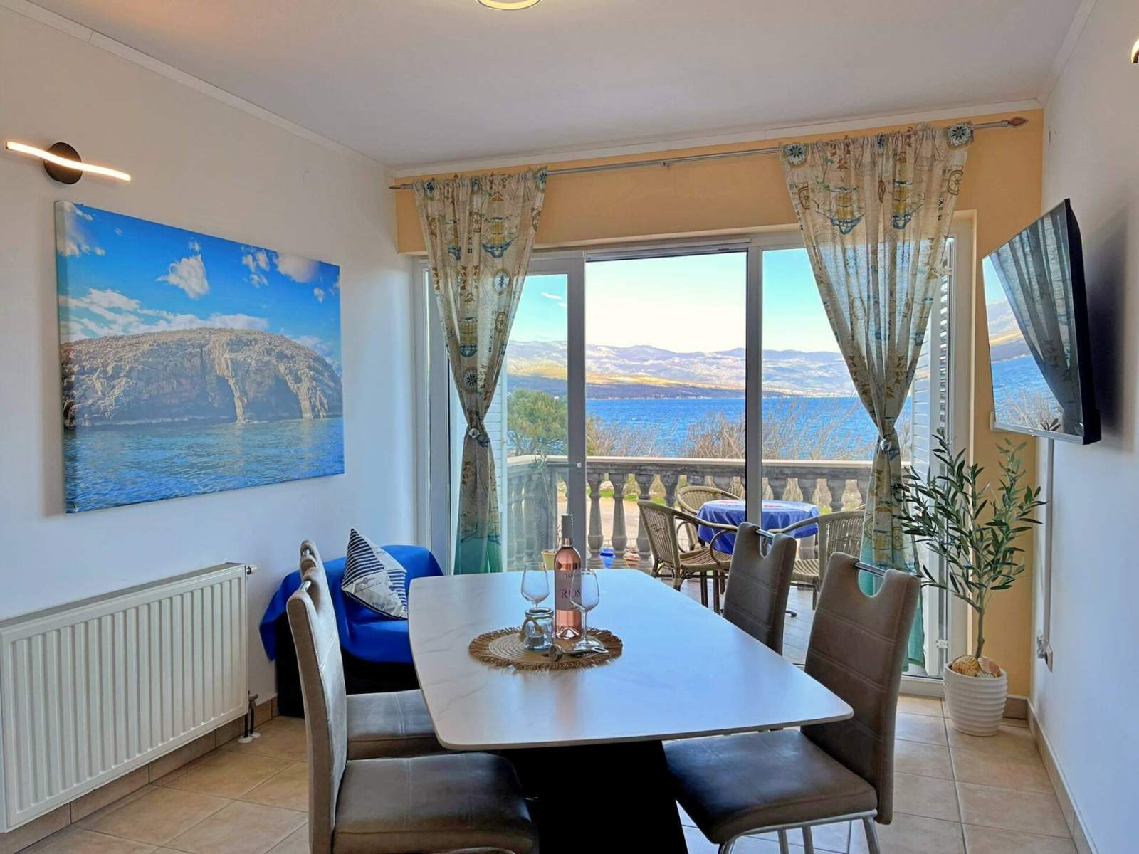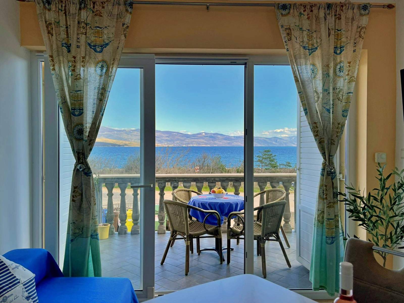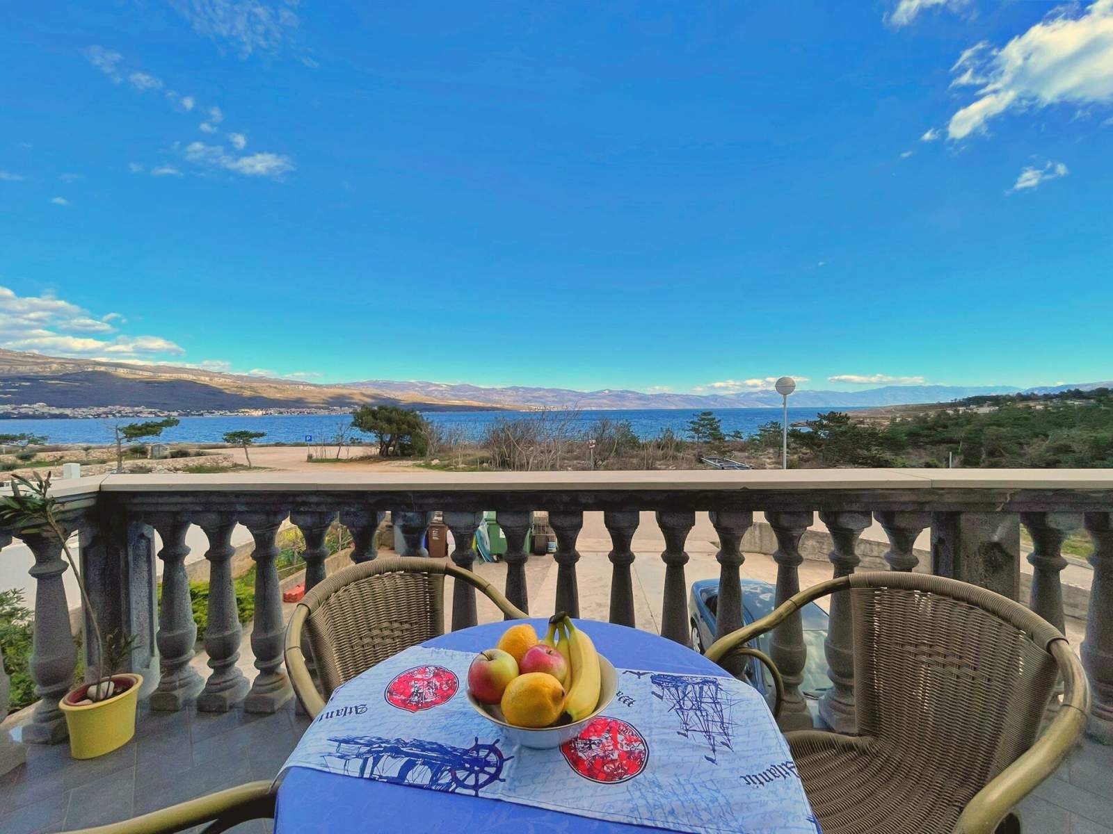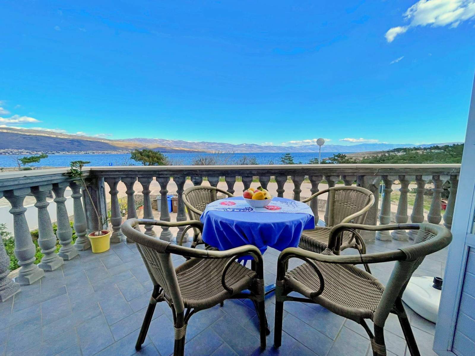 This apartment, just 20 meters from the sea and beach, is located on the first floor and features two bedrooms — one with a queen-size bed and another with two single beds. The open-plan living, dining, and kitchen area includes a dining table, couch, air conditioning, and satellite/cable TV. The kitchen is equipped with a 4-burner induction stove, fridge with freezer, coffee machine, kettle, and toaster. The bathroom has a shower and toilet. Step onto your private balcony (6 m2) with outdoor furniture and enjoy views of the backyard, nature, quiet street and sea. Bed linens, towels, free Wi-Fi, and a parking space are provided. A popular local bistro and a diving center are conveniently located just downstairs, offering traditional Mediterranean cuisine and underwater adventure. In the diving center you can arrange a dive from the boat or from the shore.