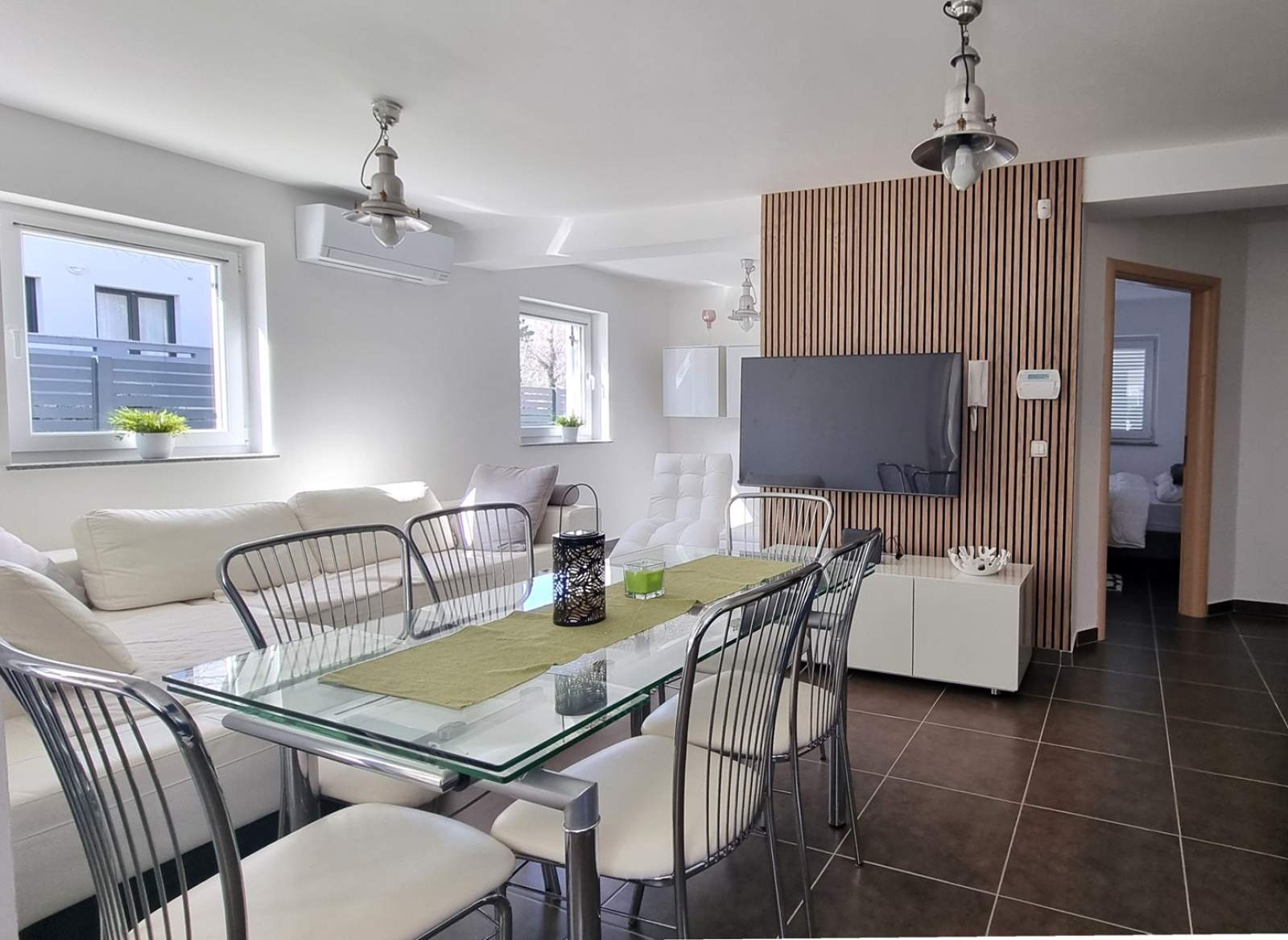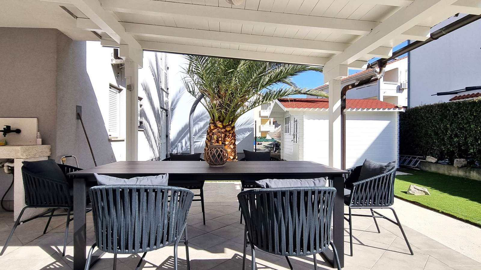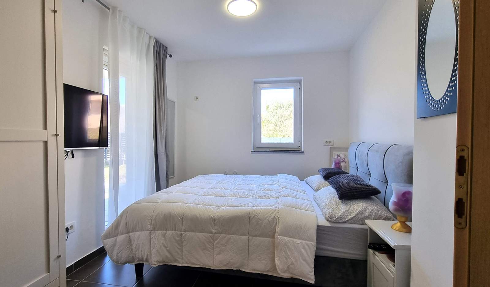 The apartment comes with a fully equipped kitchen with living room and dining area (an additional bed for 2 persons on the couch), 2 bathrooms (shower, toilet, washing machine in one) and a partialli covered terrace with garden (25 m2).