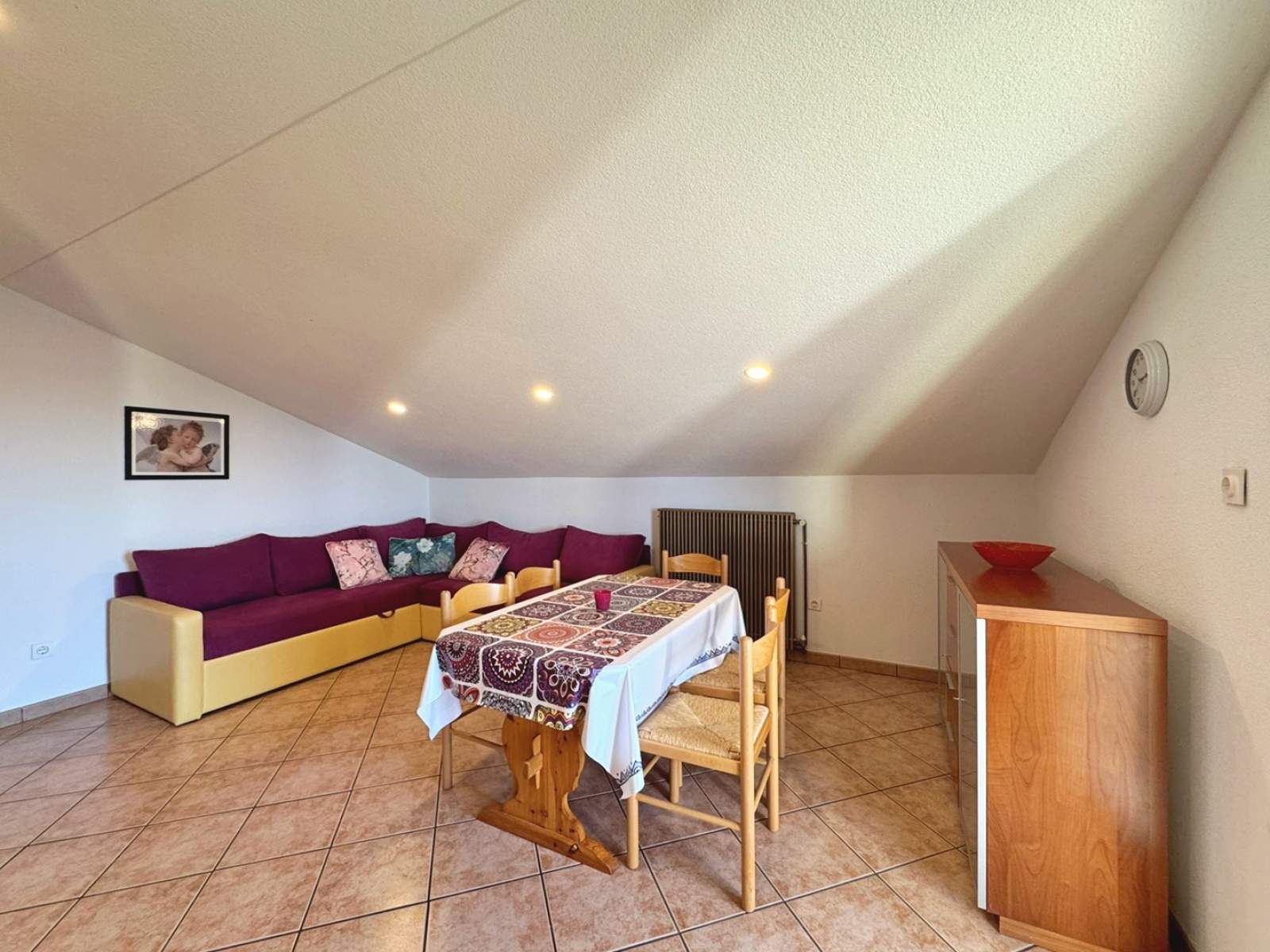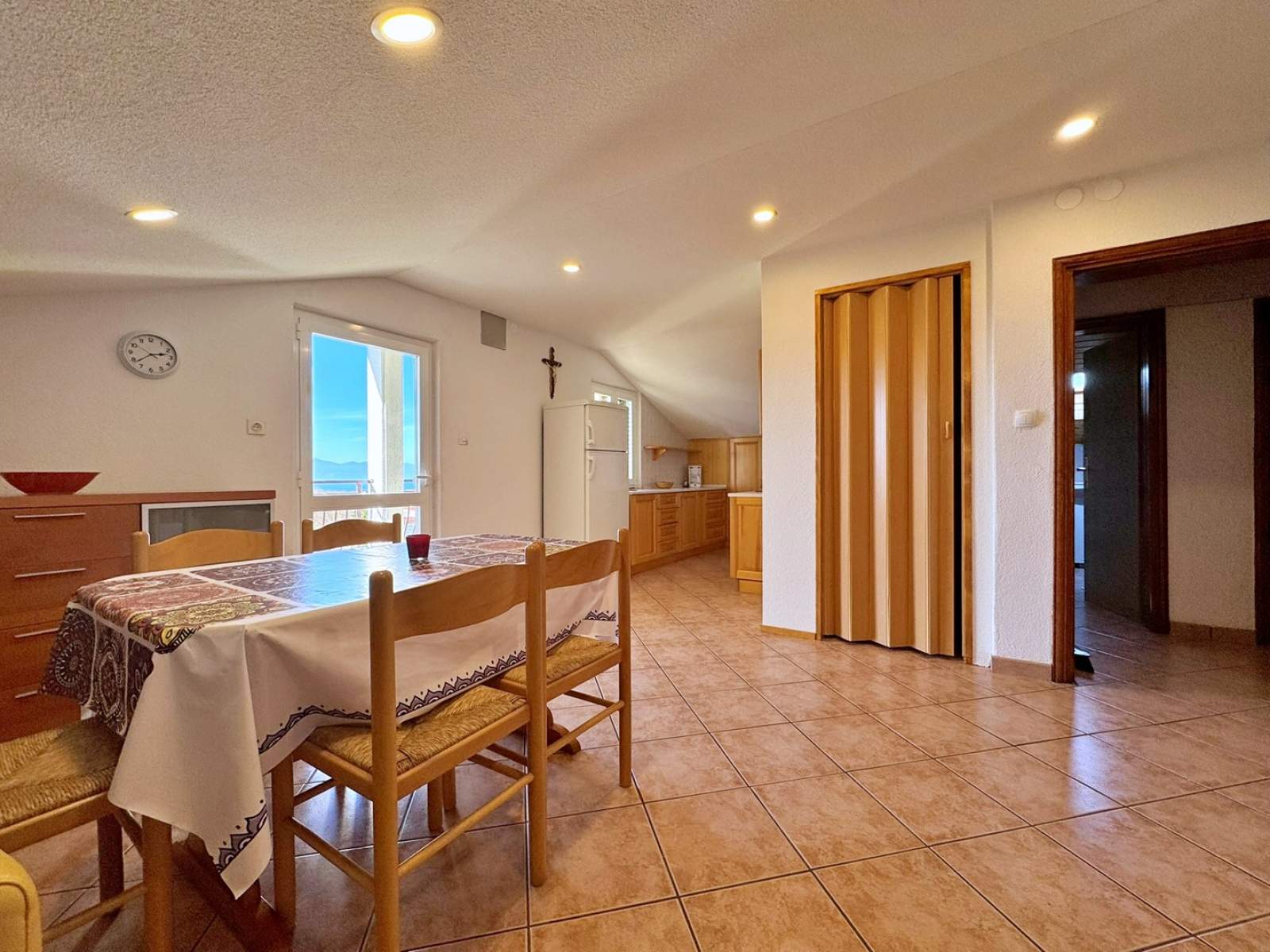 This comfortable attic-apartment, located approx. 2.5 km from the sea and beach, offers everything you need for a relaxing stay. It features a spacious shared yard with a BBQ and many parking possibilities. Inside, there are two bedrooms — one with a queen-sized bed and the other with three single beds, making it ideal for families or groups. The cozy air-conditiong living room with sea view is equipped with a couch and dining table.