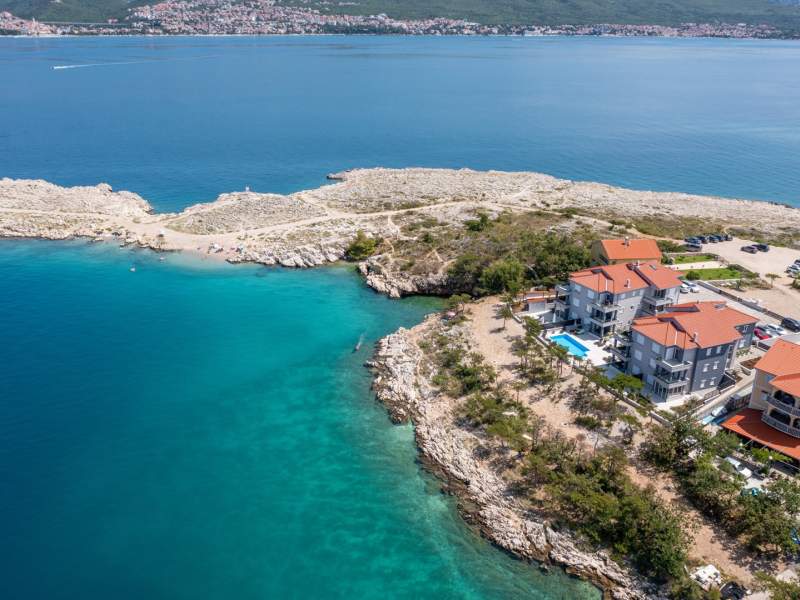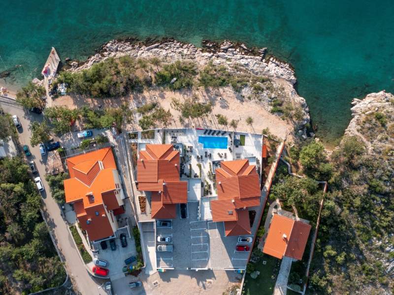 These modern apartments with swimming pool and sea view are located in a building complex in a quiet location just 30 meters from the sea. The building offers a communal saltwater swimming pool (36 m2) open from May to October, with temperatures typically reaching 20-26°C. The pool area is equipped with sun loungers, parasols, and an outdoor shower, and it provides direct access to the sea for comfortable swimming. A shared laundry room on the ground floor includes a washing machine, laundry capsules/detergent, and an iron for guest use. The apartment complex is just a 1 km stroll along the seaside from the town center, a comfortable 15-minute walk. Nearby, you'll find a pebble beach with a beach bar, along with a basketball court and a beach volleyball court. Adjacent to the complex, a diving center offers lessons for beginners and guided dives for experienced divers. This center also houses one of the region's top restaurants, serving a variety of traditional Mediterranean dishes. Free private parking is provided, and each apartment is air-conditioned to ensure a comfortable stay. The complex has a private parking lot with a gate that opens and closes via remote control.