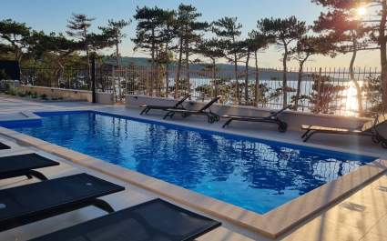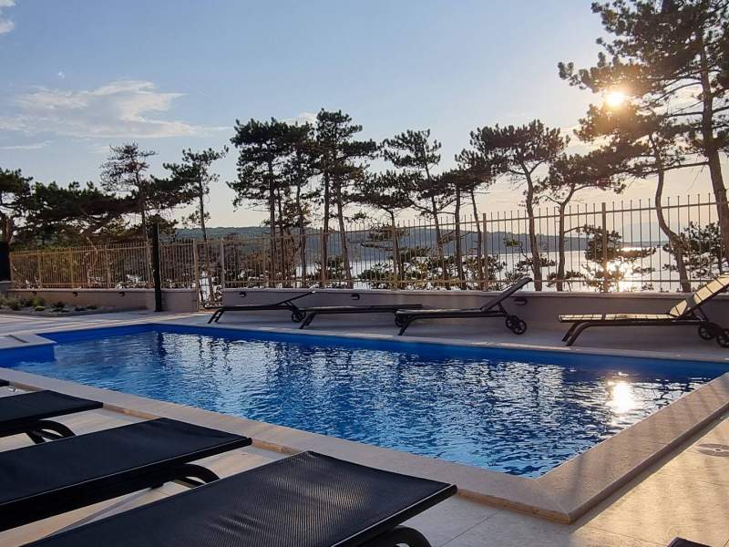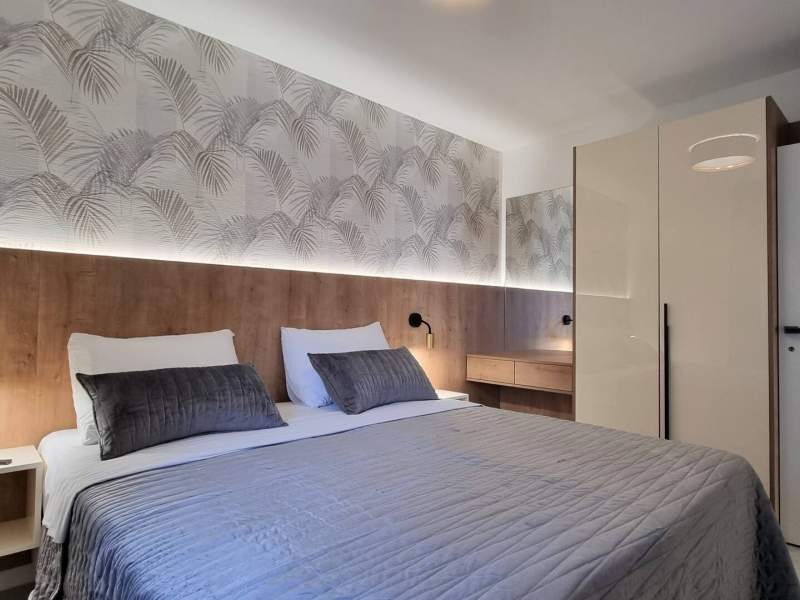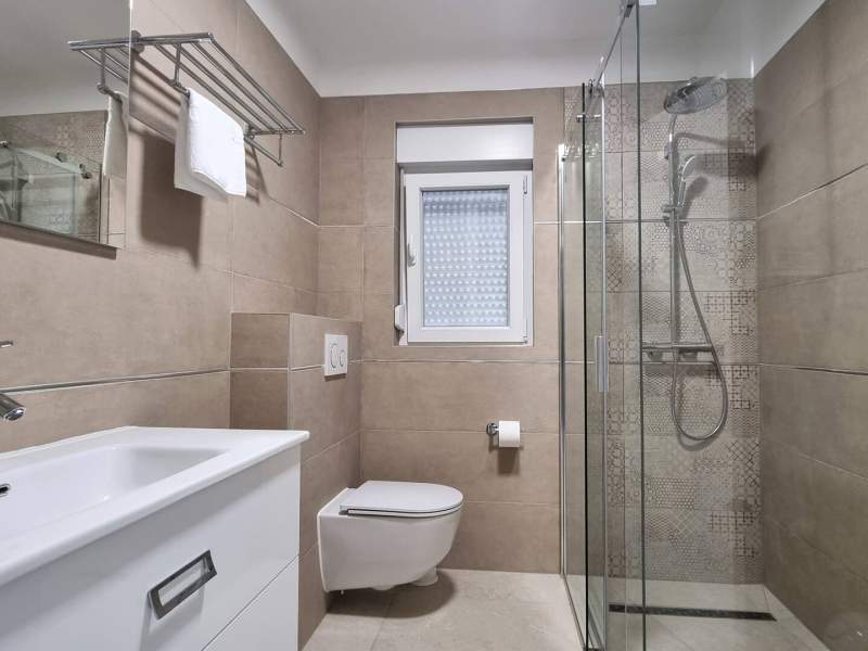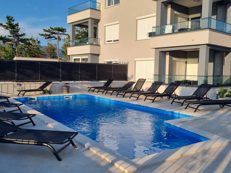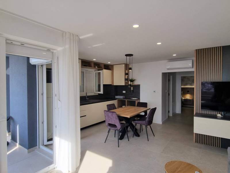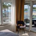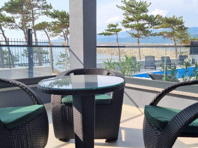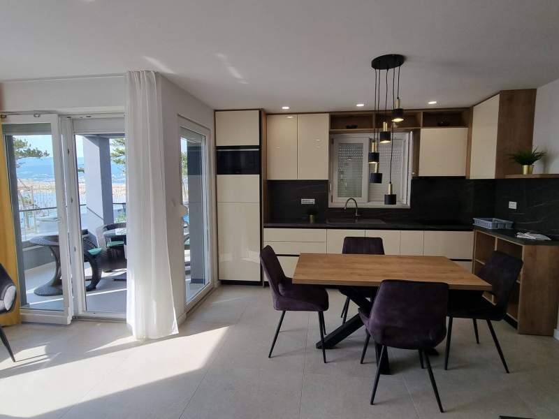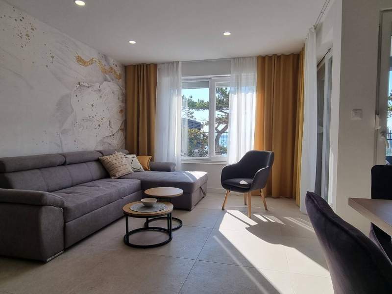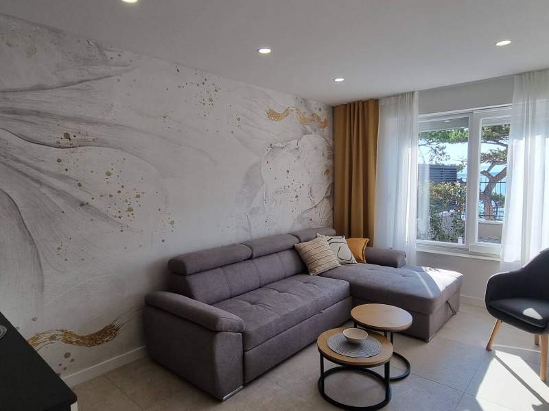 This luxurious, modern seafront apartment is located in a peaceful apartment complex just 30 meters from the sea, surrounded by nature, secluded coves, pebble beaches, and hiking trails. It offers a communal saltwater swimming pool (36 m2) open from May to October, with temperatures typically reaching 20-26°C. The apartment is on the ground floor and features one bedroom with a queen-size bed, a modern kitchen with an induction hob, refrigerator and freezer, kettle, coffee machine, toaster, microwave, and dishwasher. The bathroom has a shower and a toilet. The dining area and living room provide a cozy space with a sofa and Smart TV, while free Wi-Fi is available throughout.
