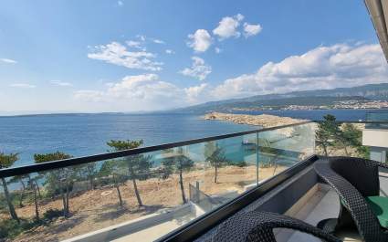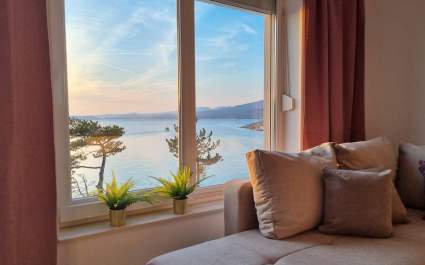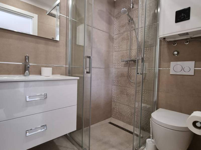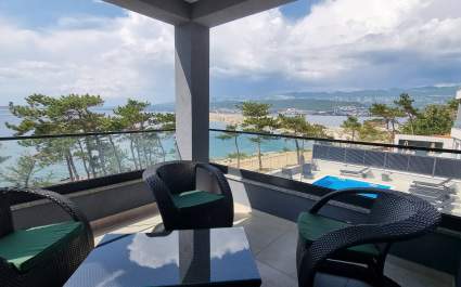 This luxurious, modern seafront studio apartment is located in a peaceful apartment complex just 30 meters from the sea, surrounded by nature, secluded coves, pebble beaches, and hiking trails. It offers a communal saltwater swimming pool (36 m2) open from May to October, with temperatures typically reaching 20-26°C. The studio apartment is located on the ground floor and features one queen-size bed, a Smart TV, a well-equipped kitchen/dining and seating area with an induction hob, refrigerator and freezer, kettle, coffee machine, toaster, microwave, and dishwasher. The bathroom has a shower and a toilet. Free Wi-Fi is available throughout.