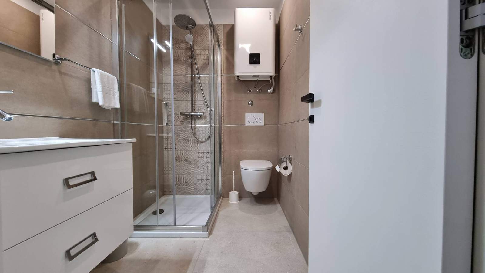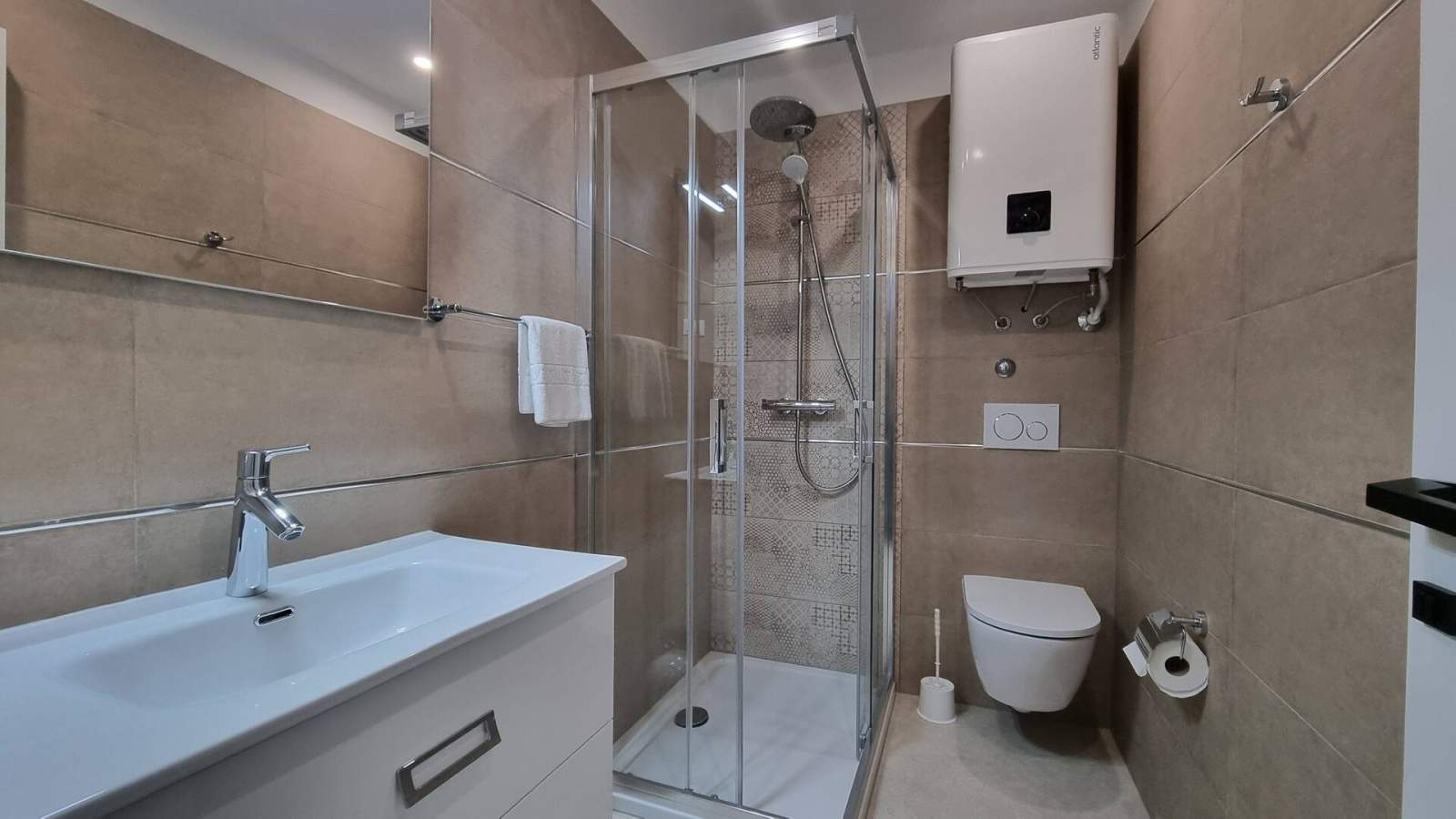 This luxurious, modern seafront studio apartment is located in a peaceful apartment complex just 30 meters from the sea, surrounded by nature, secluded coves, pebble beaches, and hiking trails. It offers a communal saltwater swimming pool (36 m2) open from May to October, with temperatures typically reaching 20-26°C. The studio apartment is located on the ground floor and features one double bed, a Smart TV, a well-equipped kitchen/dining and seating area with an induction hob, refrigerator and freezer, kettle, coffee machine, toaster, microwave, and dishwasher. The bathroom has a shower and a toilet. Free Wi-Fi is available throughout.
