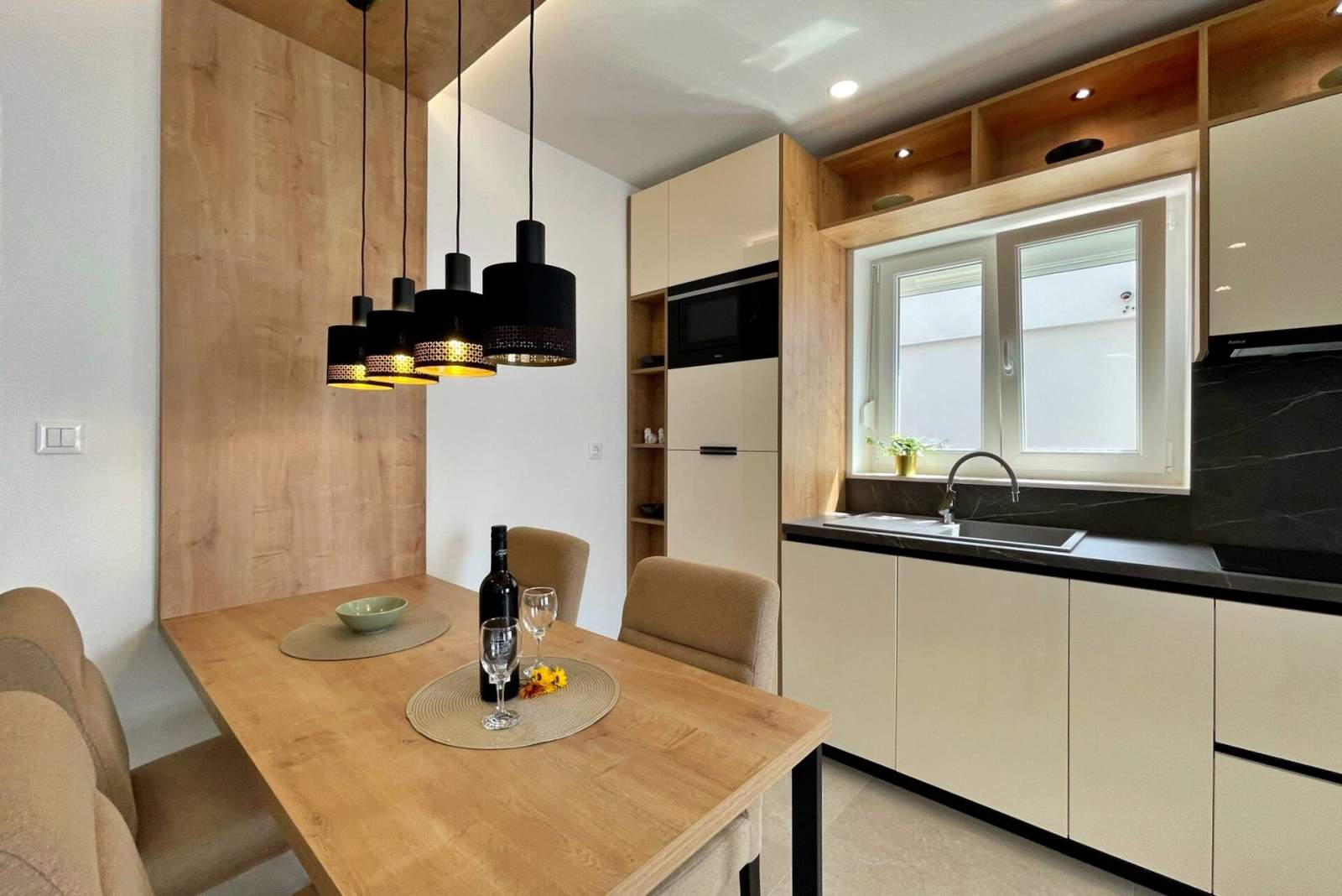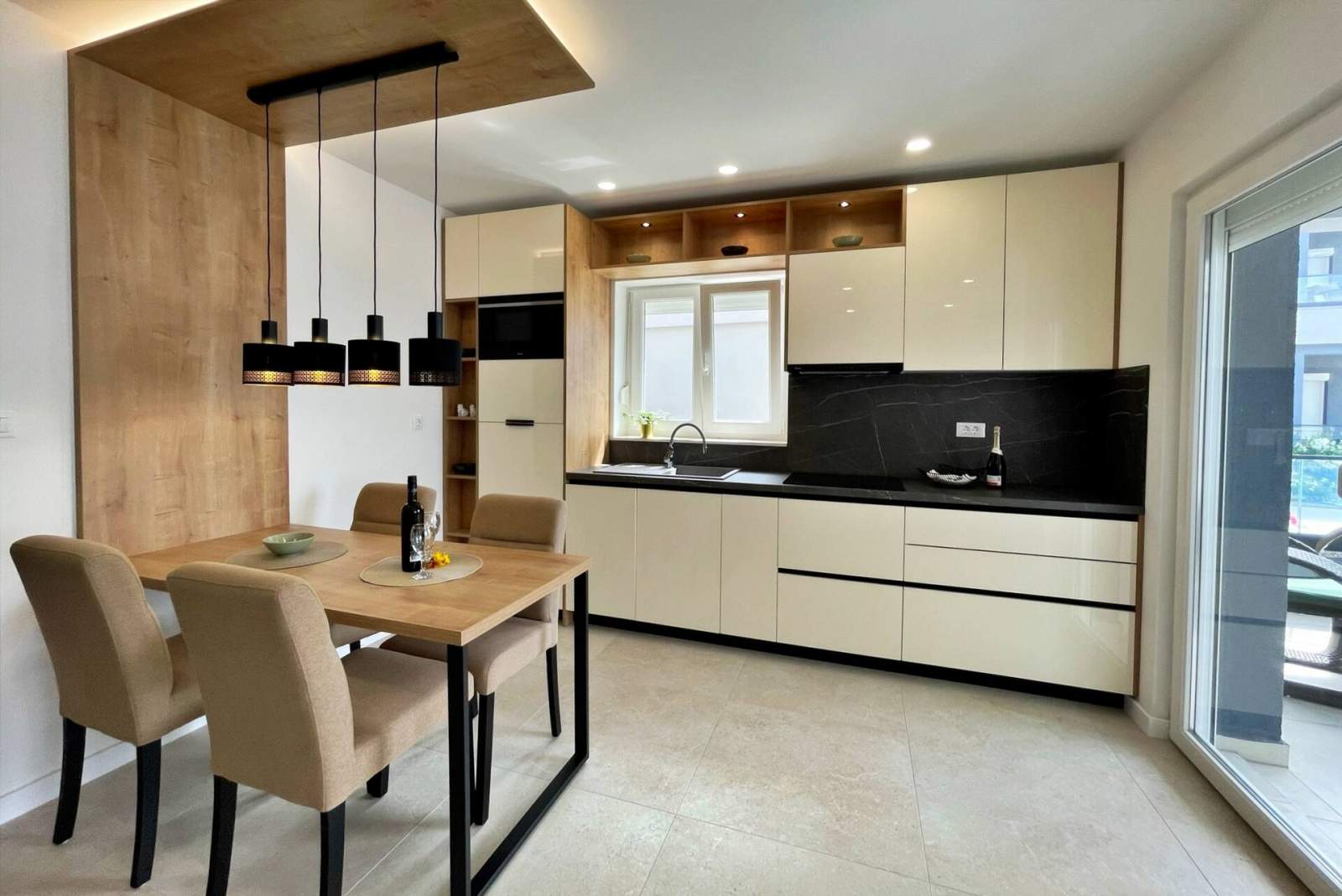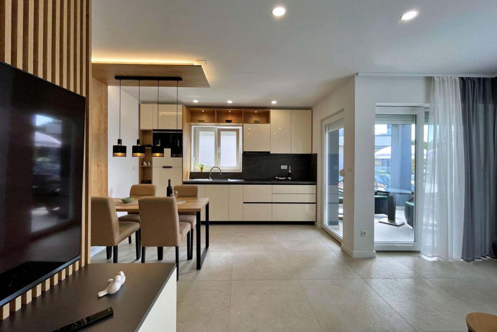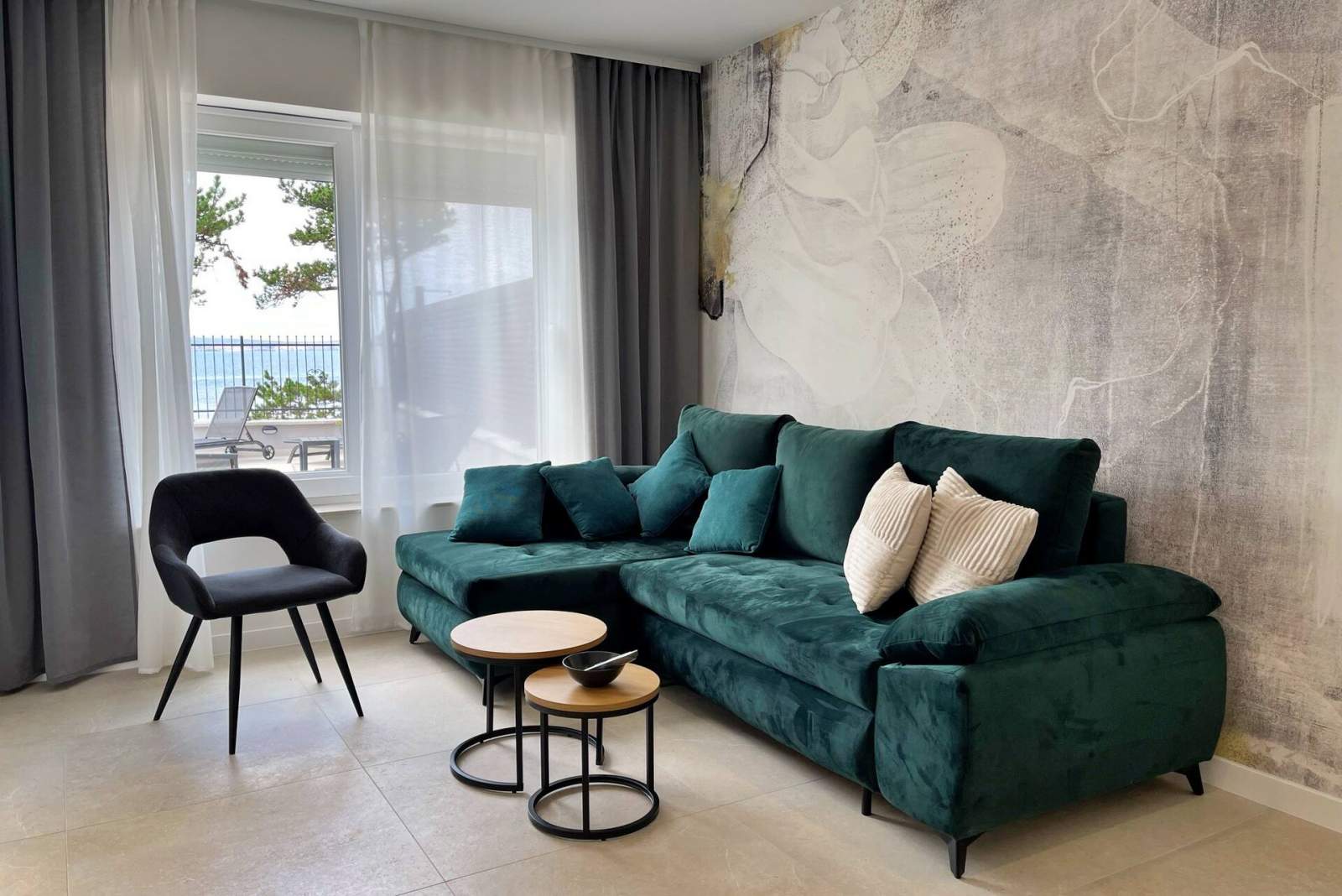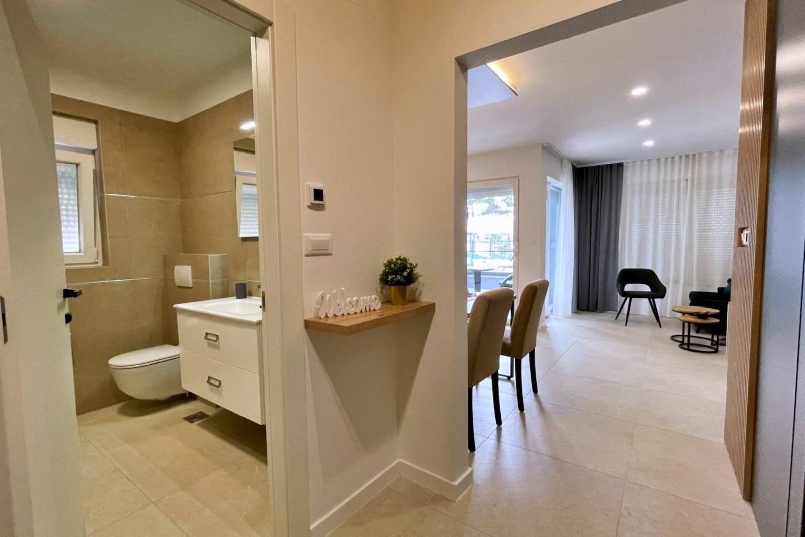 This luxurious, modern seafront apartment is located in a peaceful apartment complex just 30 meters from the sea, surrounded by nature, secluded coves, pebble beaches, and hiking trails. It offers a communal saltwater swimming pool (36 m2) open from May to October, with temperatures typically reaching 20-26°C. The apartment is on the ground floor and features one bedroom with a queen-size bed, a modern kitchen with an induction hob, refrigerator and freezer, kettle, coffee machine, toaster, microwave, and dishwasher. The bathroom has a shower and a toilet. The dining area and living room provide a cozy space with a sofa and Smart TV, while free Wi-Fi is available throughout.