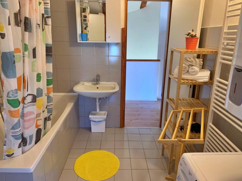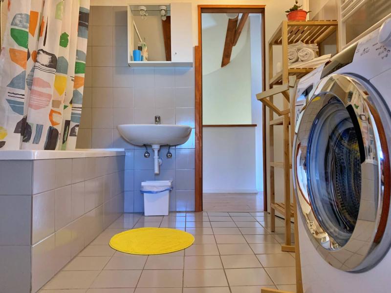 Upstairs, two bedrooms each have an en suite bathroom: one with a shower, the other with a bathtub, washing machine, and both with toilets. One bedroom has its own balcony (4 m2) with stunning views of the sea and town. The sandy beach is only 90 meters away, and the town center is an easy 450-meter walk.
