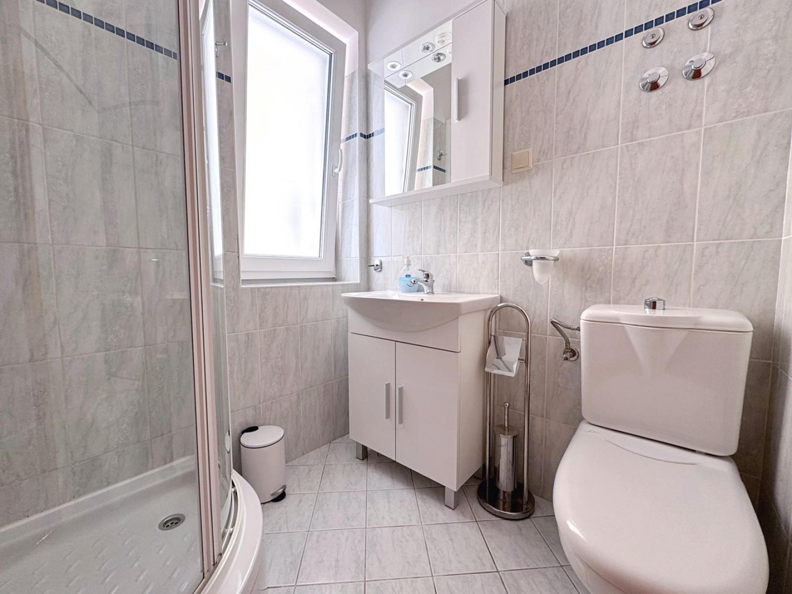 A 10 m2 terrace in front of the entrance has dining table and a sea view. The bathroom includes a shower, toilet, and hairdryer. Guests can enjoy an outdoor shower, a shared BBQ area, and private parking conveniently located behind the house.