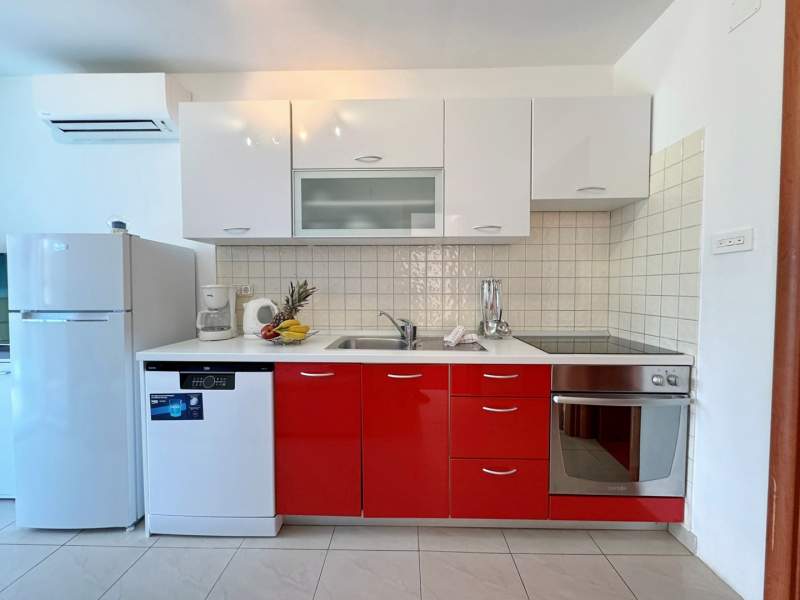The kitchen is equipped with a ceramic stove, oven, fridge with freezer, coffee machine, and kettle. The bathroom has a shower, toilet, and hairdryer. The 20 m2 terrace with a sea view, dining table, and parasol provides the perfect spot to unwind. Guests also have access to a shared BBQ and free parking behind the house.