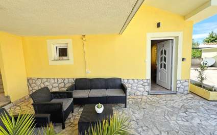 This modern, ground-floor apartment is designed for comfort and convenience, located 1.65 km from the sea. It features a fully equipped kitchen with a ceran stove, oven, fridge with freezer, coffee machine, kettle, and dining table. The living room offers a sofa (which can serve as a single bed), satellite TV, Wi-Fi, and air conditioning. The cozy bedroom includes a queen-size bed, and the bathroom is fitted with a shower, toilet, and bidet. Outside, relax on the 15 m2 roofed terrace with garden views, or use the shared BBQ area. Bed linens and towels are provided, and the owner also offers laundry services for the guests. A baby cot is available upon request. The entire unit is wheelchair-friendly as well. Pets are welcome for a fee and there is a private parking for you in the yard. The owner lives in the same house and is there for you should you need anything!