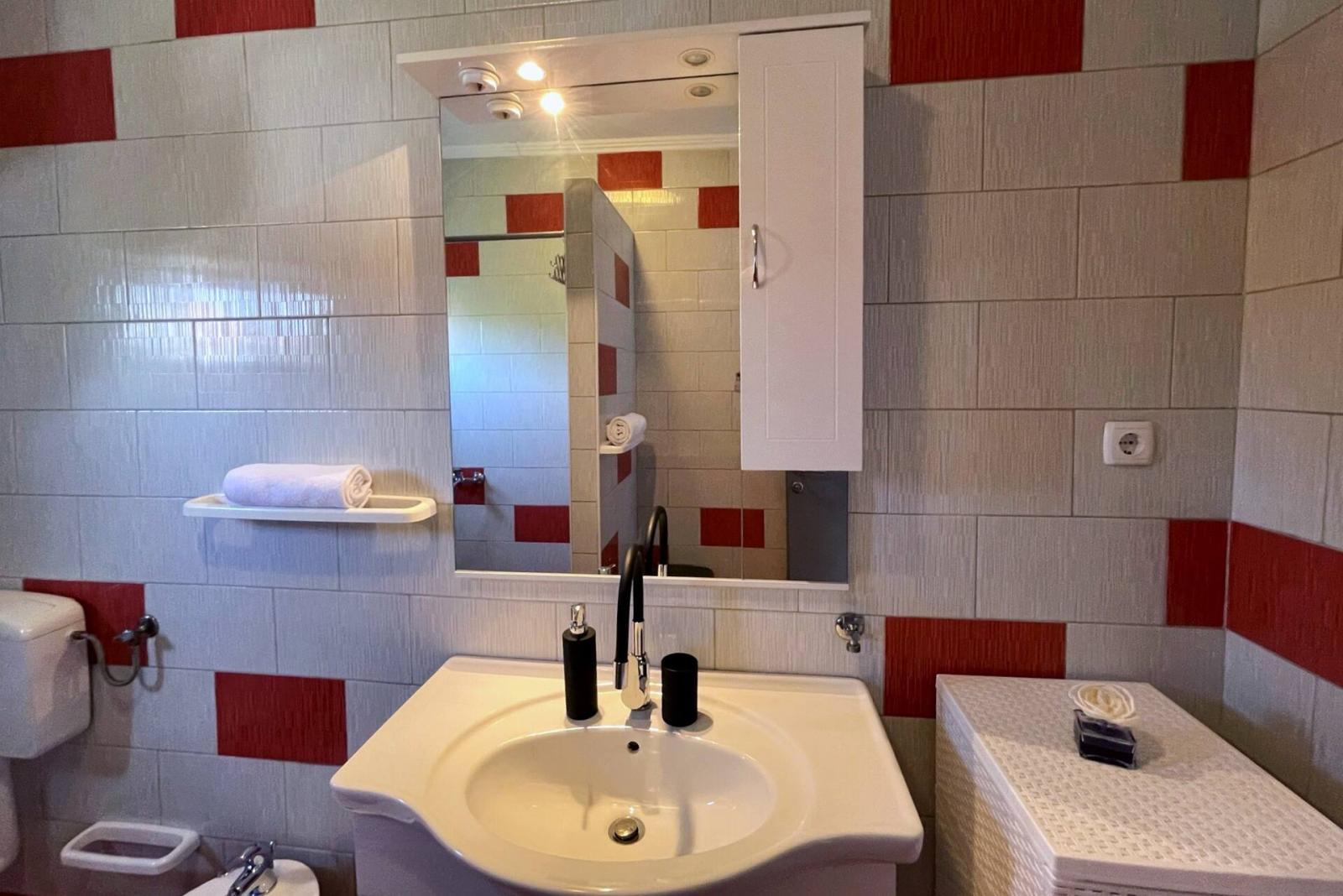 This modern three-bedroom apartment is located 1.65 km from the sea. It features a fully equipped kitchen with a gas/electric stove, oven, fridge with freezer, coffee machine, kettle, and dishwasher. The living room offers a sofa, dining table, satellite TV, Wi-Fi, and air conditioning. The bedrooms have queen-size beds, and one of the bedroom has sea view and exit to the terrace. The bathroom is fitted with a shower, toilet, and bidet. Outside, relax on the 24 m2 terrace with sea and garden views. There is also a shared BBQ area on the ground floor in the yard. Bed linens and towels are provided, and the owner also offers laundry services for the guests. A baby cot is available upon request. There is a private parking space for you in the yard. The owner lives in the same house and is there for you should you need anything!