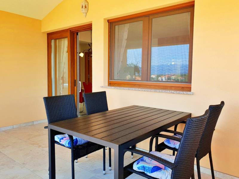 This cozy attic apartment offers two bedrooms with queen beds and a 15 m2 roofed terrace with a dining table and breathtaking panoramic sea views. The kitchen is fully equipped with a ceramic stove, oven, fridge with freezer, dishwasher, coffee machine, kettle, and a dining table. The living room features air conditioning, satellite TV, a sofa, and terrace access. The apartment includes a bathroom with a shower, toilet, and hairdryer. Guests enjoy free Wi-Fi, private parking, a gas BBQ, and access to a shared yard with a children's playground. Located just 160 m from the concrete and pebble beach, the house also offers floor cooling and heating for year-round comfort.