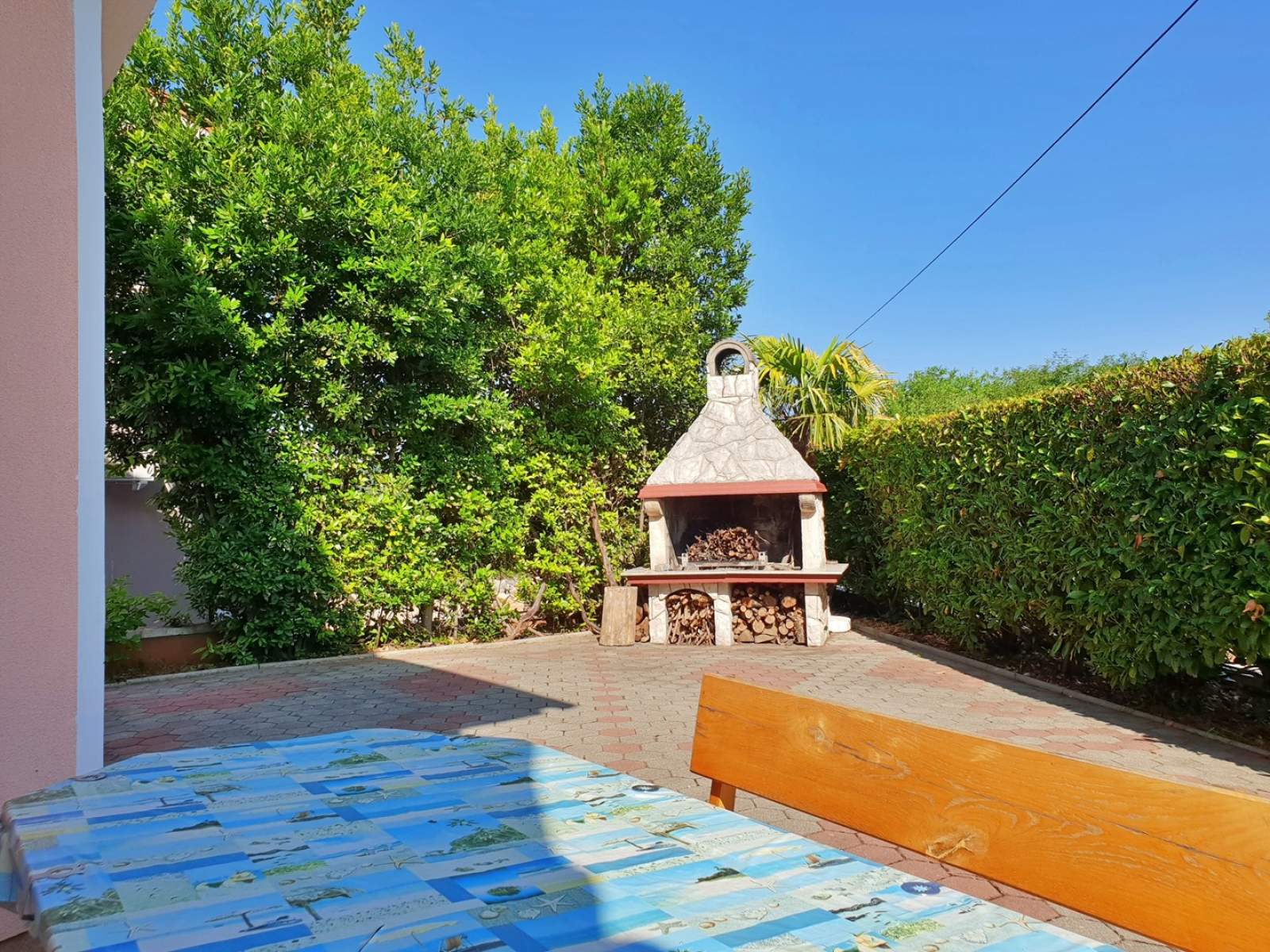 This first-floor apartment, located just 250 m from the sea, features a cozy 3 m2 balcony. The kitchen is equipped with an electric stove, oven, fridge with freezer compartment, coffee machine, kettle, and toaster. The air-conditioned living room offers a dining table, a seating area with a pull-out couch for two, cable/satellite TV, Wi-Fi, and direct access to the balcony. The bedroom includes a queen bed, and the bathroom is fitted with a shower, toilet, and hairdryer. Guests can enjoy a shared BBQ in the yard and free private parking.