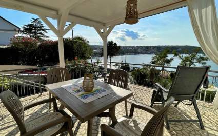 This charming seafront apartment located on the first floor is perfect for up to 3 guests. It offers a queen bedroom, a convertible sofa, and a bathroom with shower. Just 15 m from the sea and 500 m from the center, it features a spacious 50 m2 terrace with sun loungers, dining area, BBQ, and stunning sea views. The kitchen is fully equipped, and amenities include Wi-Fi, air conditioning, satellite TV, and private parking. The owners live downstairs and are available during your stay.