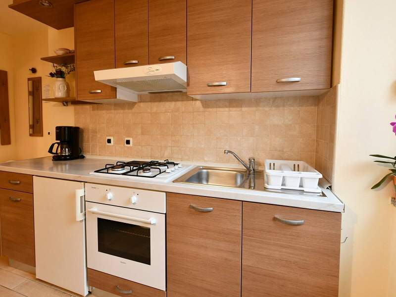 The apartment features a fully equipped kitchen with living room and dining area (an additional bed on the couch) and a bathroom (shower, toilet).