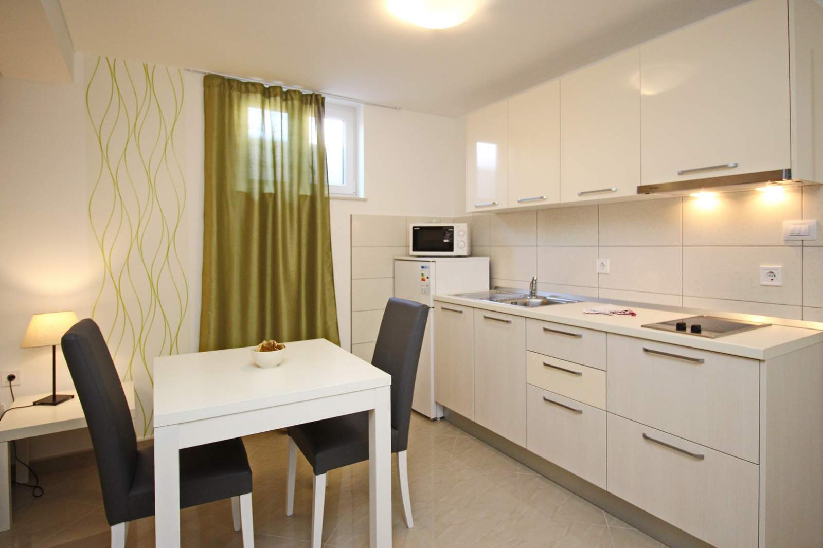 This studio apartment is located on the underground level (subterrain) of a house with shared pool, about 300 m from the main beach of Baska and 200 m from the city center.