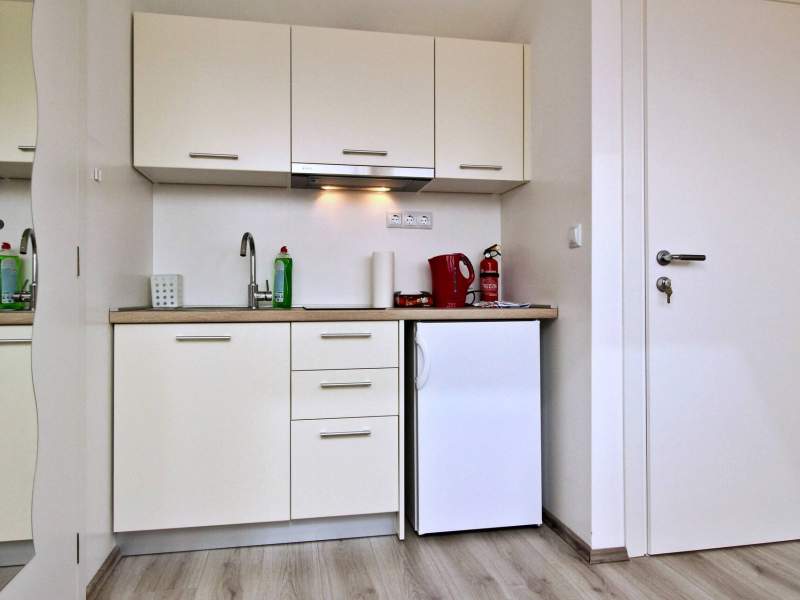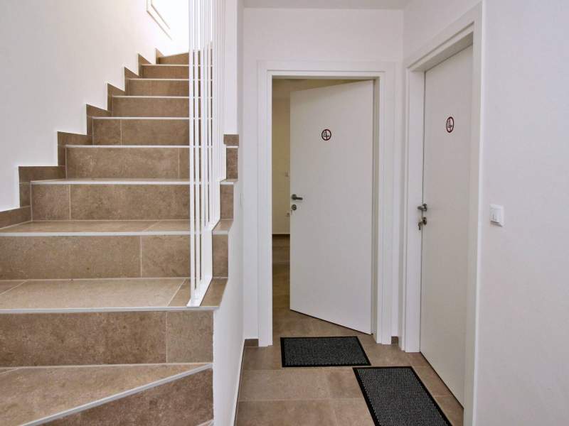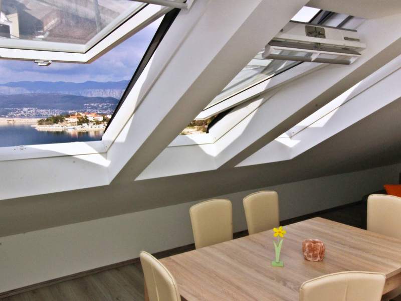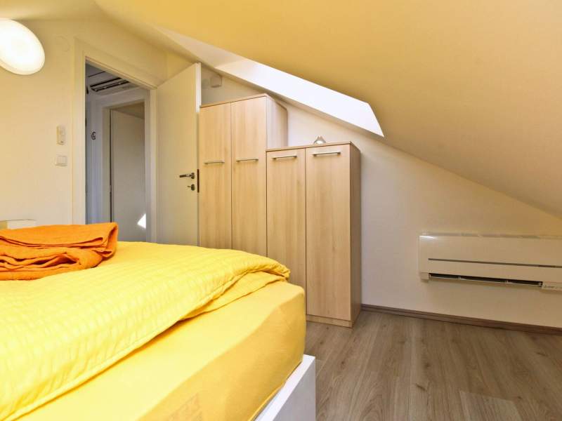 Ovaj apartman u potkrovlju smješten je samo 60 metara od pješčane plaže i 260 metara od centra mjesta te je idealan za obitelji ili grupe od 4-6 osoba. Sastoji se od dvije klimatizirane spavaće sobe, svaka s bračnim krevetom te dnevnog boravka s kaučem na razvlačenje za još dvije osobe. Iz dnevnog boravka pruža se prekrasan pogled na more. Čajna kuhinja je dobro opremljena sa električnim štednjakom, mini hladnjakom sa odjeljkom za zamrzavanje, aparatom za kavu, kuhalom za vodu i mikrovalnom pećnicom.
