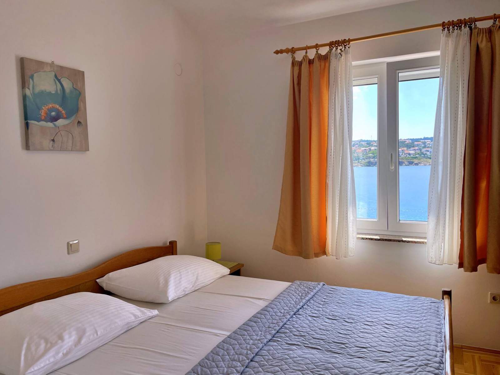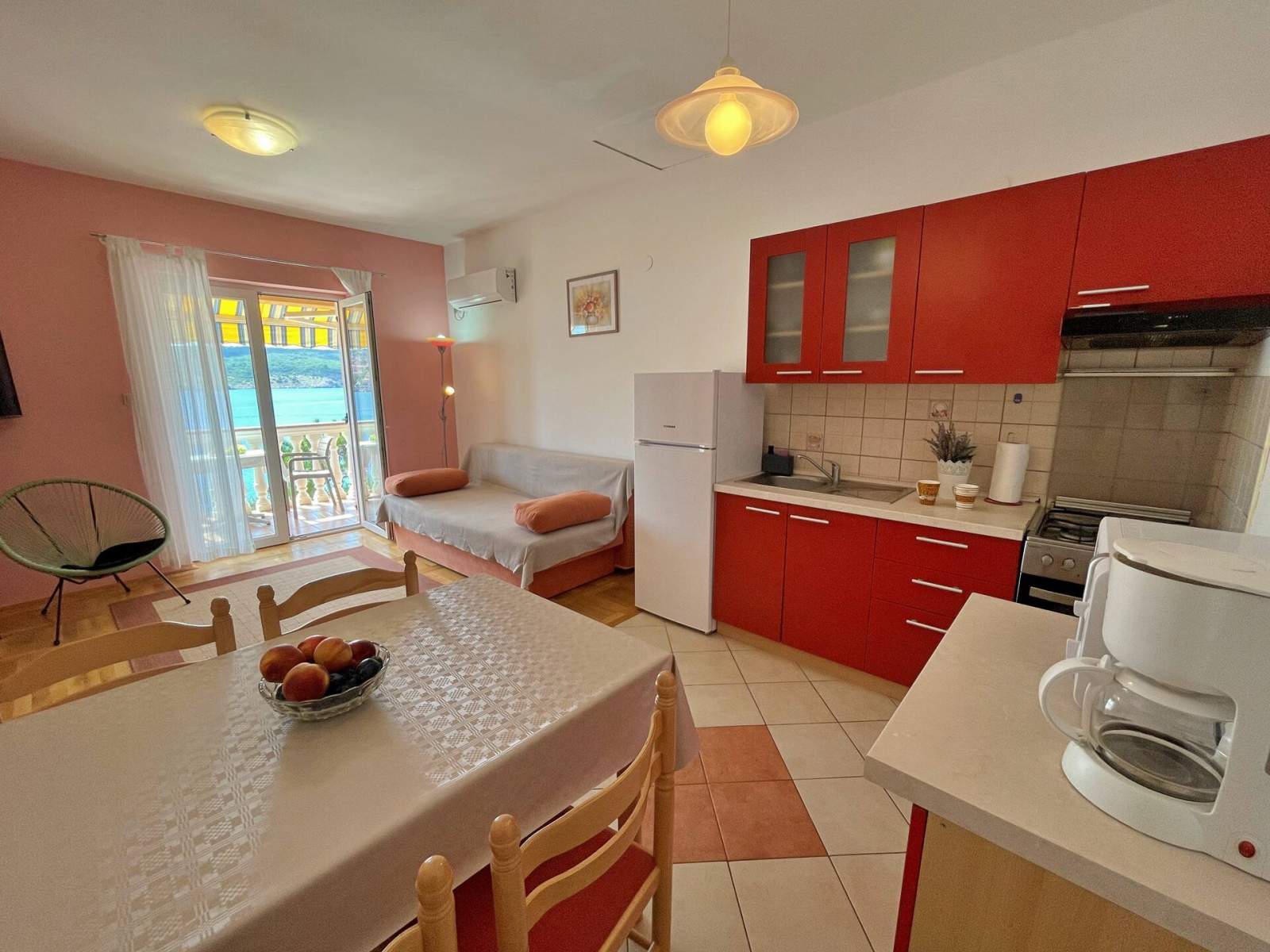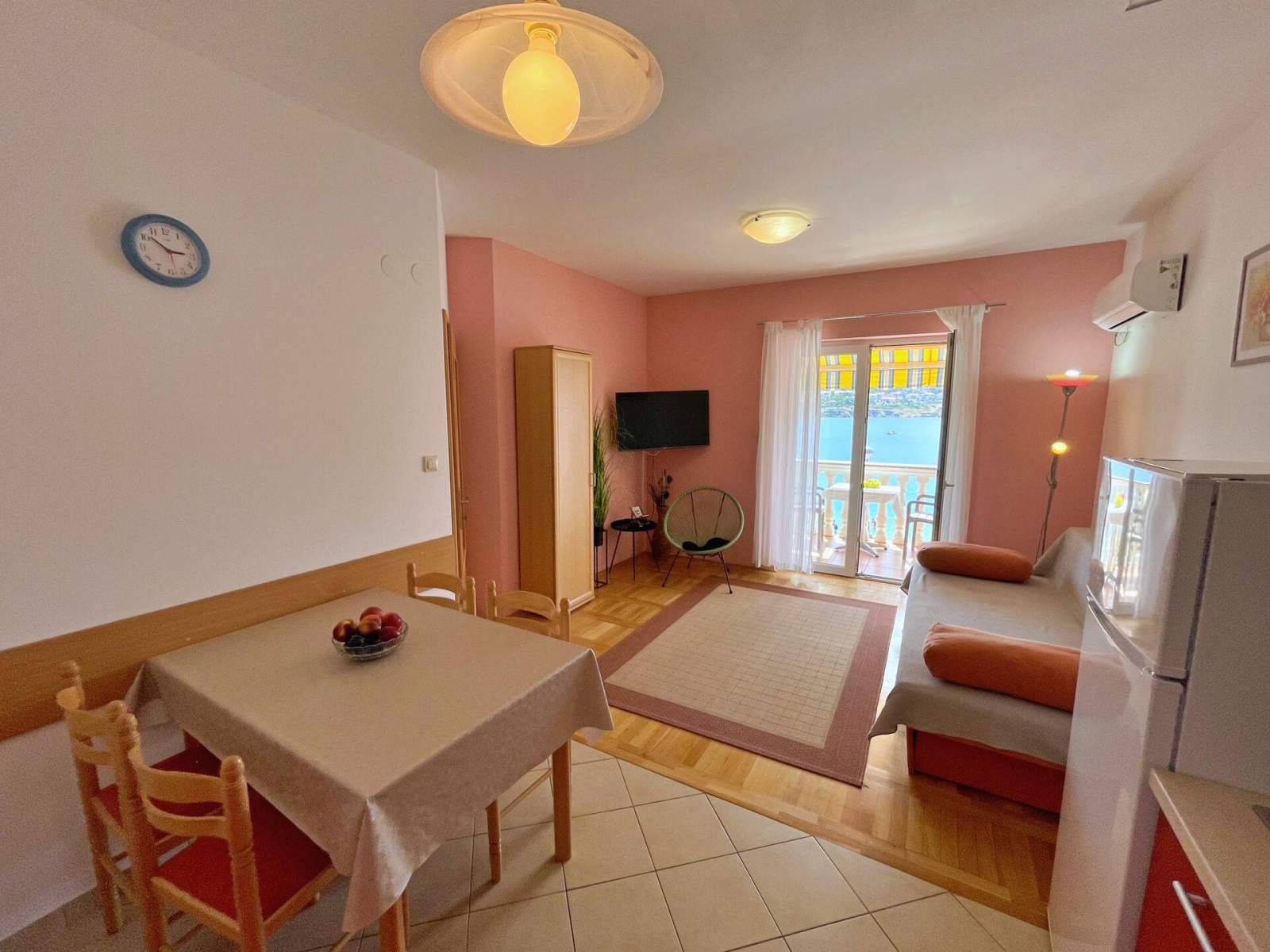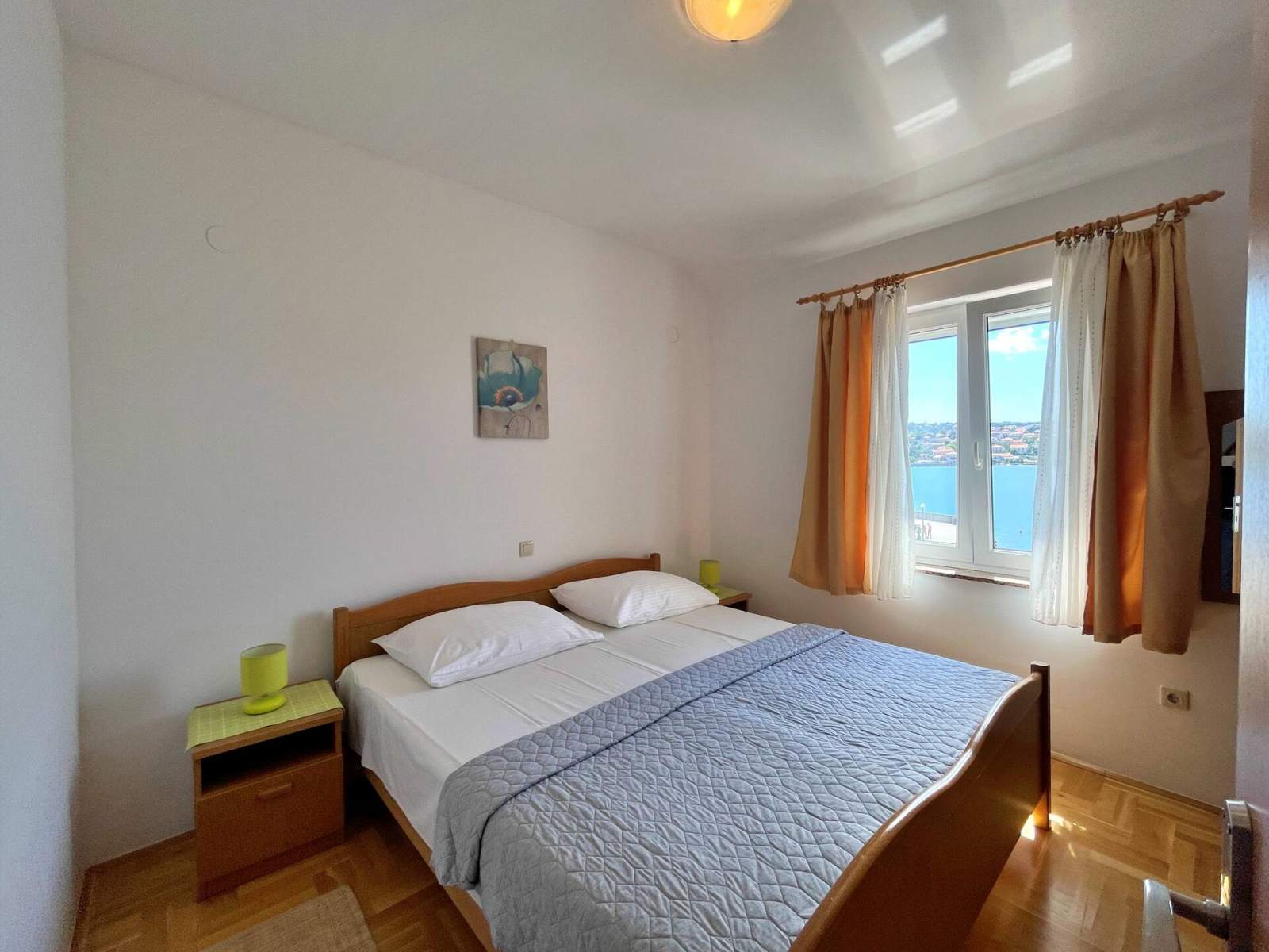 Ovaj ugodan jednosobni apartman nalazi se samo 10 metara od plaže i nudi privatni balkon (6 m2) s prekrasnim pogledom na more, plažu i mjesto. Gostima je na raspolaganju roštilj, besplatan Wi-Fi, privatno parkirno mjesto i zajednički vanjski tuš. Klima uređaj dostupan je uz nadoplatu od 7,00 EUR po noćenju. U spavaćoj sobi je udoban bračni krevet, a u dnevnom boravku se nalazi kauč na razvlačenje za još jednu osobu. Kuhinja, blagovaonica i dnevni boravak uključuju električni/plinski štednjak s 4 plamenika, hladnjak sa zamrzivačem, pećnicu, mikrovalnu pećnicu, aparat za kavu, kuhalo za vodu i toster. Dnevni dio također ima kauč na razvlačenje, SAT TV i direktan izlaz na natkriveni balkon. Svi prozori su opremljeni mrežama protiv komaraca za dodatnu udobnost. Dječji krevetić ili hranilica dostupni su na zahtjev prije dolaska (ovisno o raspoloživosti).