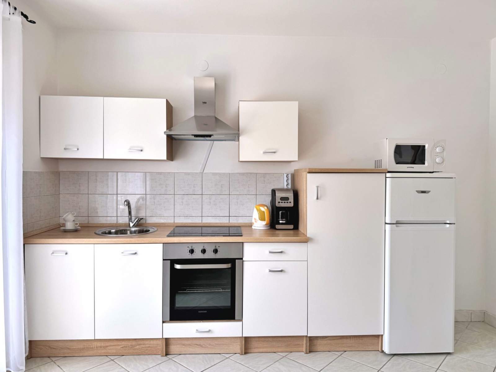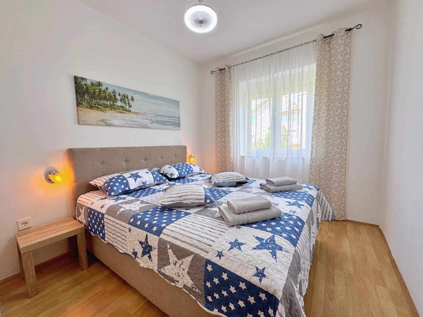 Smješten samo 450 m od mora i 40 m od supermarketa u mirnom dijelu, ovaj apartman na prvom katu savršen je za opuštajući boravak. Sadrži dvije spavaće sobe s bračnim krevetima, od kojih jedna ima izlaz na balkon. Dnevni boravak i kuhinja dijele otvoreni prostor opremljen električnim štednjakom, pećnicom, hladnjakom, mikrovalnom pećnicom, tosterom, kuhalom za vodu i aparatom za kavu. Kupaonica sadrži tuš, WC, bide i sušilo za kosu. Iz dnevnog boravka također se izlazi na balkon (6 m2) s pogledom na zelenilo. Uživajte u pogodnostima kao što su klima uređaj, Wi-Fi i besplatan parking. Gosti također mogu koristiti zajednički vrt s roštiljem i prostorom za sjedenje.
